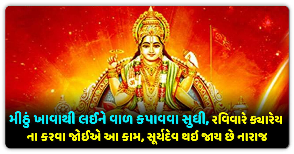 હિંદુ ધર્મમાં જ્યોતિષવિદ્યાને વધુ મહત્વ આપવામાં આવે છે. સૌરમંડળના કેટલાક ગ્રહોની અસર અઠવાડિયાના બધા જ દિવસોને અસર કરે છે. આવી સ્થિતિમાં આજે આપણે કેટલાક એવા કાર્યો વિશે જણાવવા જઈ રહ્યા છીએ, જે તમારે રવિવારે ક્યારેય કરવા જોઈએ નહીં.