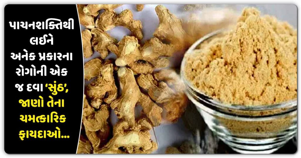 શું તમે જાણો છો કે આદુ જે શાકભાજીનો સ્વાદ વધારે છે તે ઘણી બીમારીઓથી છુટકારો મેળવવામાં મદદ કરી શકે છે. સુકા આદુ સૂંઠ લાંબા સમયથી અસરકારક દવા તરીકે ઉપયોગમાં લેવાય છે. આ આદુ સૂકવીને બનાવેલો પાવડર છે, જેનો ઉપયોગ આદુની જેમ કરવામાં આવે છે. ખોરાકમાં મસાલા તરીકે ઉપયોગમાં લેવાતા, સૂકી આદુ આંતરિક આરોગ્યથી લઈને ત્વચાની સમસ્યાઓ સુધીની દરેક બાબતમાં ફાયદાકારક હોઈ શકે છે. જાણો સૂકા આદુના એટલે કે સૂંઠના ફાયદા.