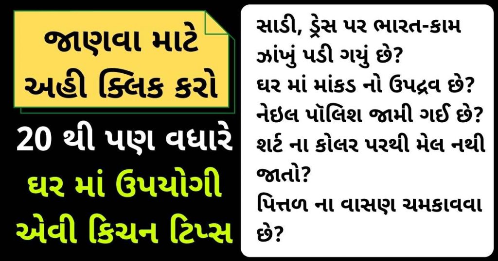 વાળ કાળા કર્યા પછી હાથ કાળા અને ભટ્ટા થઈ જાય તો લીંબુની છાલ ડો ઘસીને હાથ સાફ કરી નાંખો. હાથ તરત સાફ થઈ જશે. કોઈ પણ જાતનાં શાકનો રસ ઘણીવાર પાતળો બની જાય છે. એ રસને ઘટ્ટ બનાવવા માટે એક ચમચી ઘી કે માખણમાં એક ચમચો મેંદો શેકી નાંખો. સહેજ બ્રાઉન જેવું થાય કે એ પાતળા શાકમાં નાંખી દો. એનાથી રસ એકદમ ઘટ્ટ થઈ જશે. સૂકા ચણા, વટાણા, તેમજ બીજાં કઠોળને પાણીમાં બાફવા માટે મૂકો ત્યારે એમાં ત્રણ ચાર ટીપાં કોપરેલ નાંખી દેવાથી જલ્દી બફાઈ જશે.